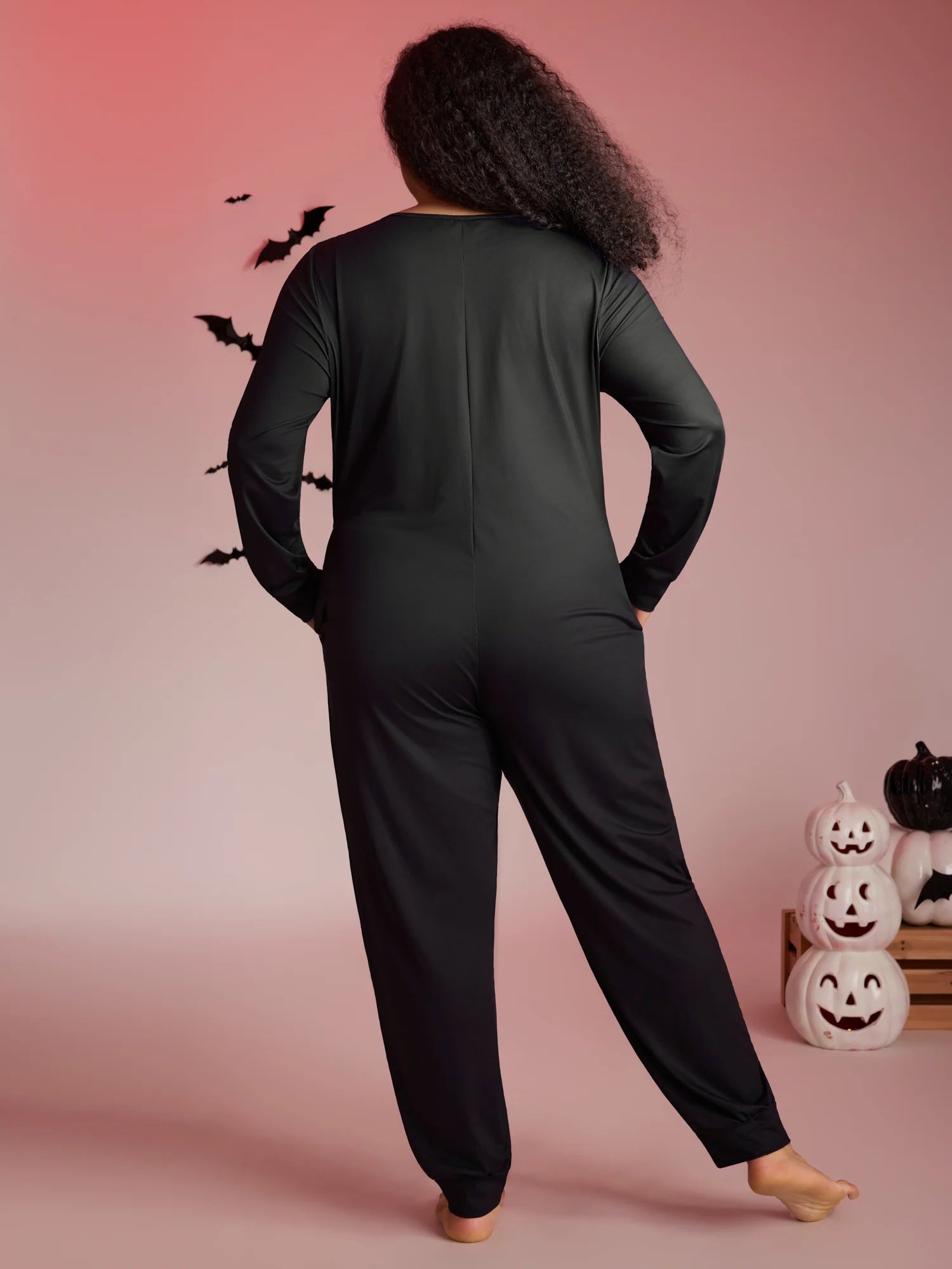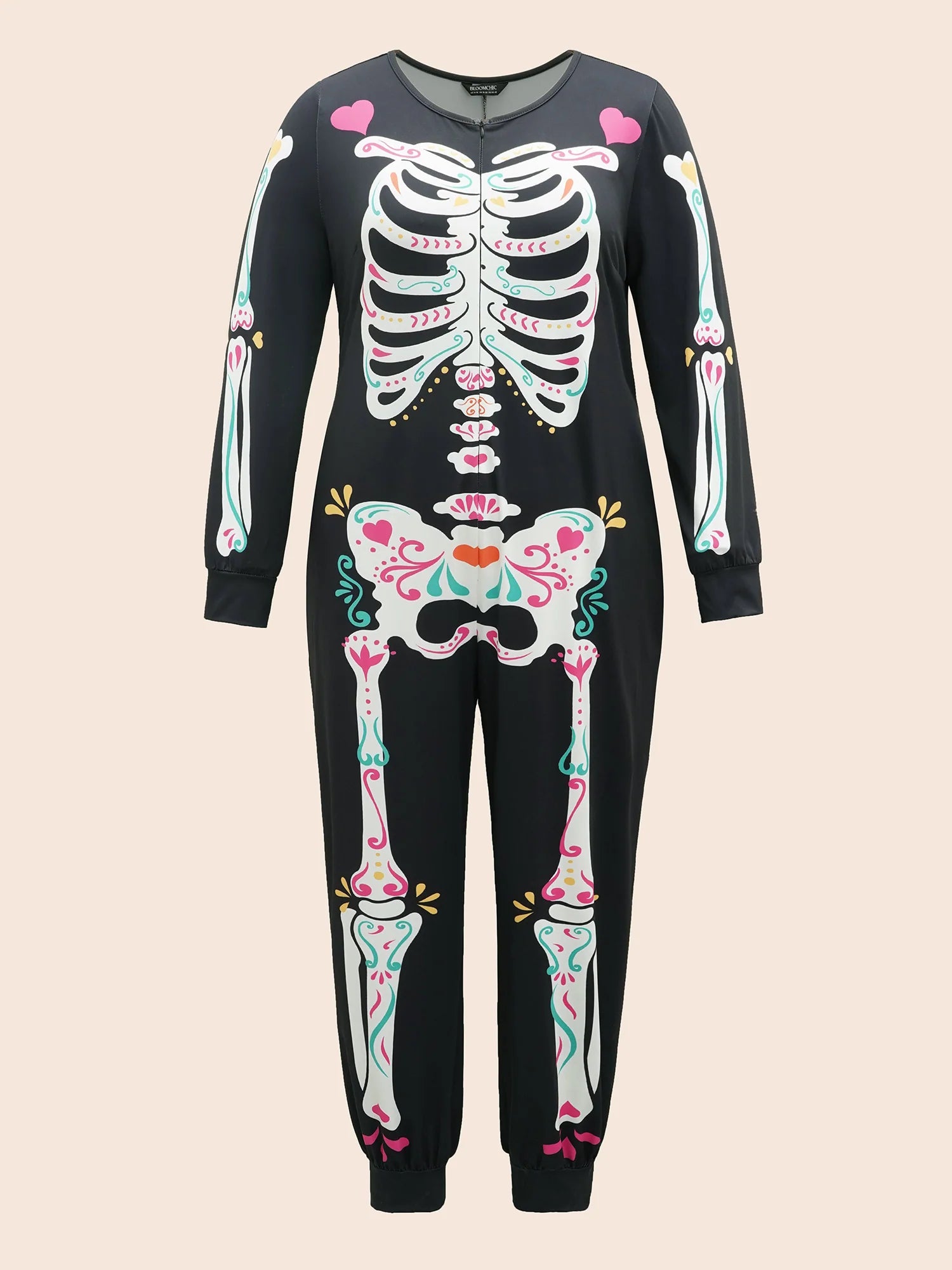Shine at any Halloween gathering with this eerie yet romantic skeletal print jumpsuit, featuring an invisible zipper for a sleek look.